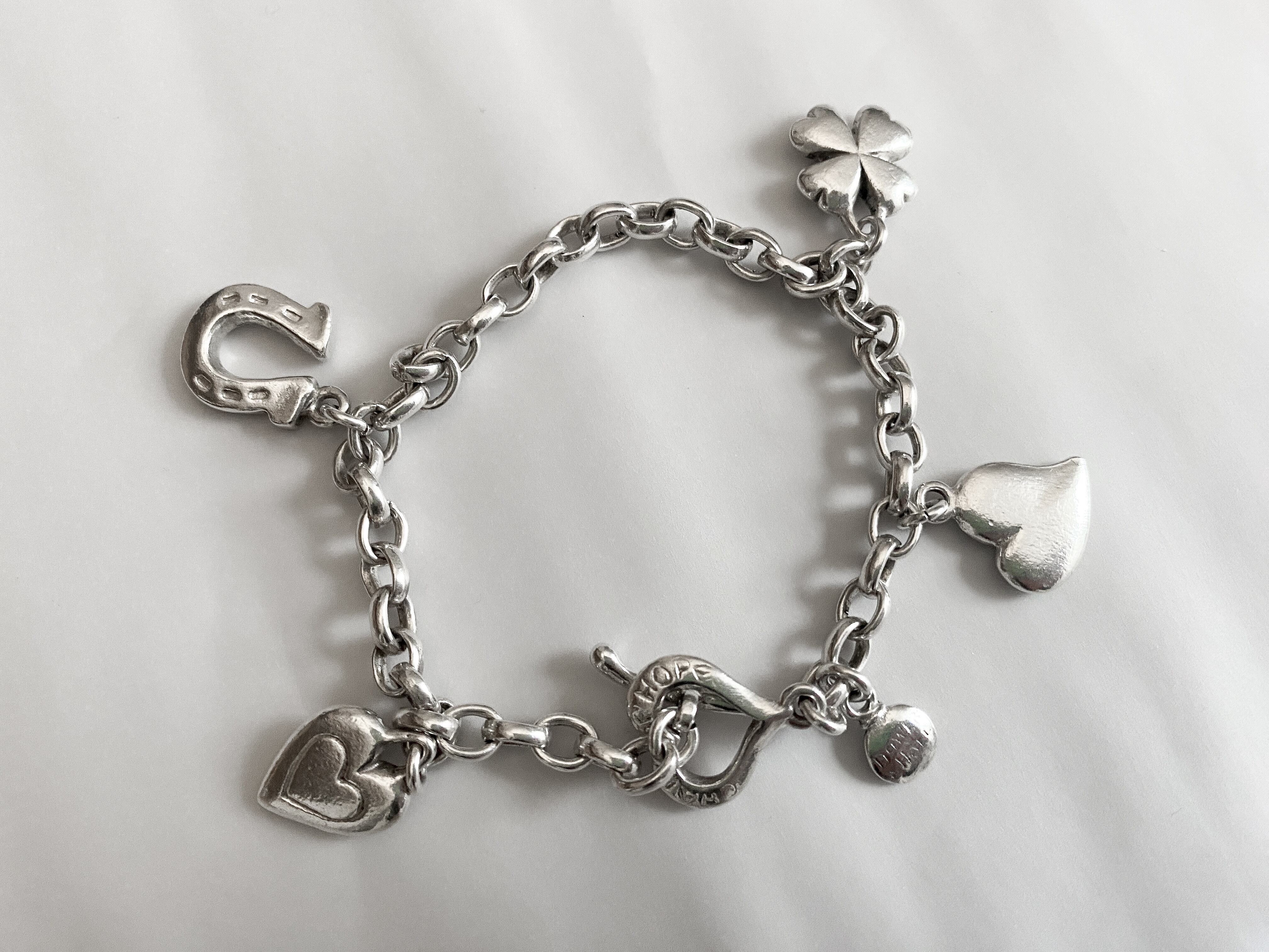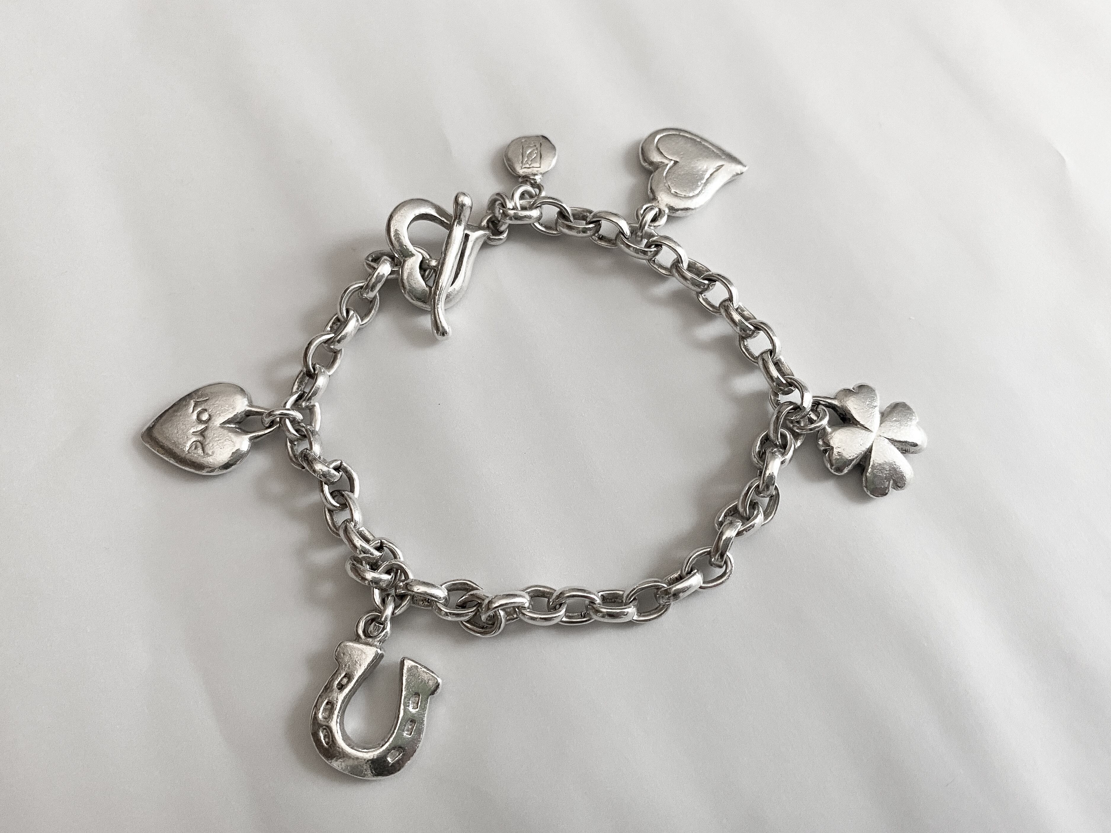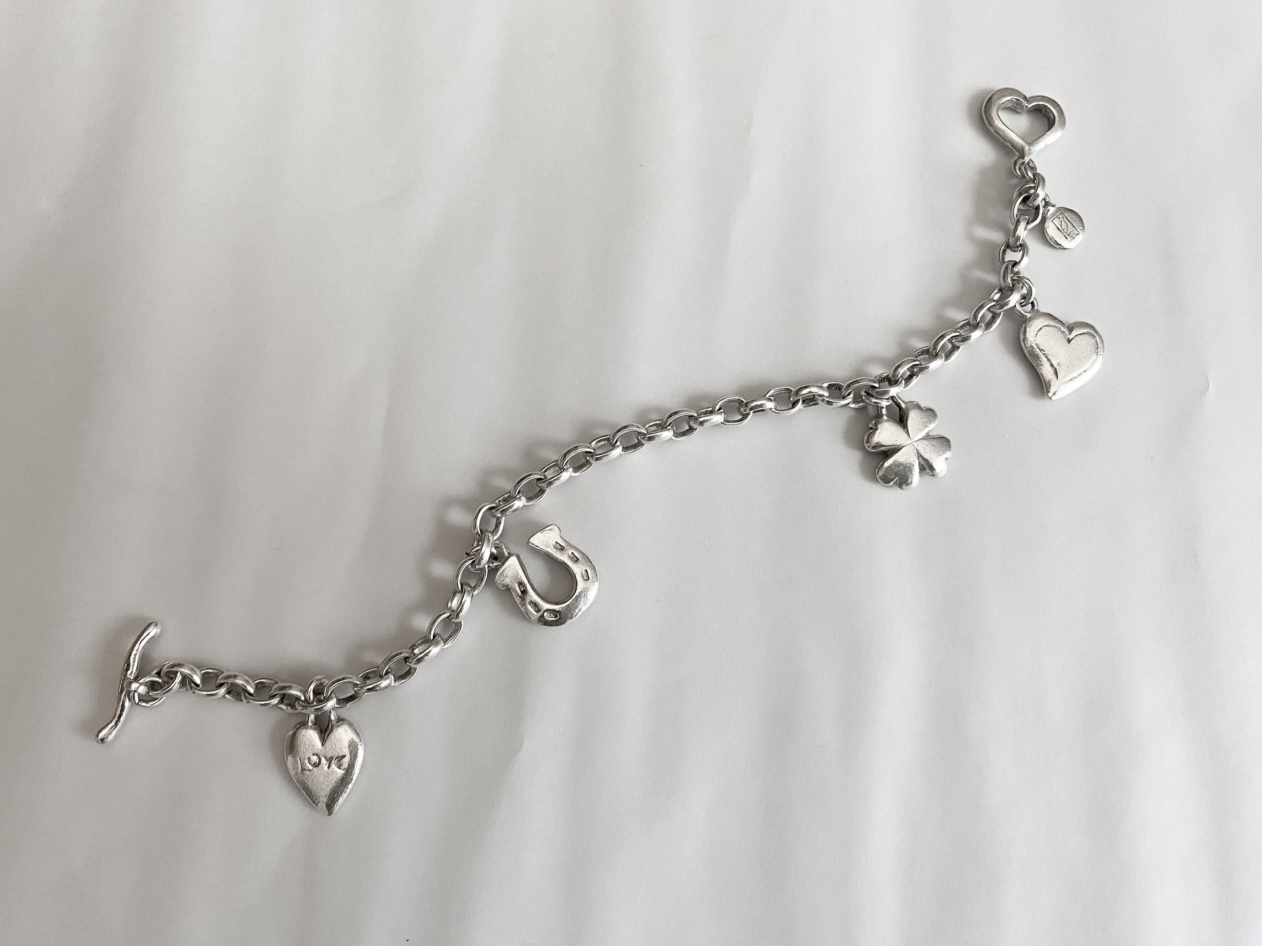 イギリスで買い付けたこのチャームブレスレットは、ハート、ホースシュー、四つ葉のクローバーモチーフが可愛らしく、つけているだけでラッキーになれるブレスレットです。日常使いから特別な日のおしゃれまで幅広くご活用いただけるアイテムです!