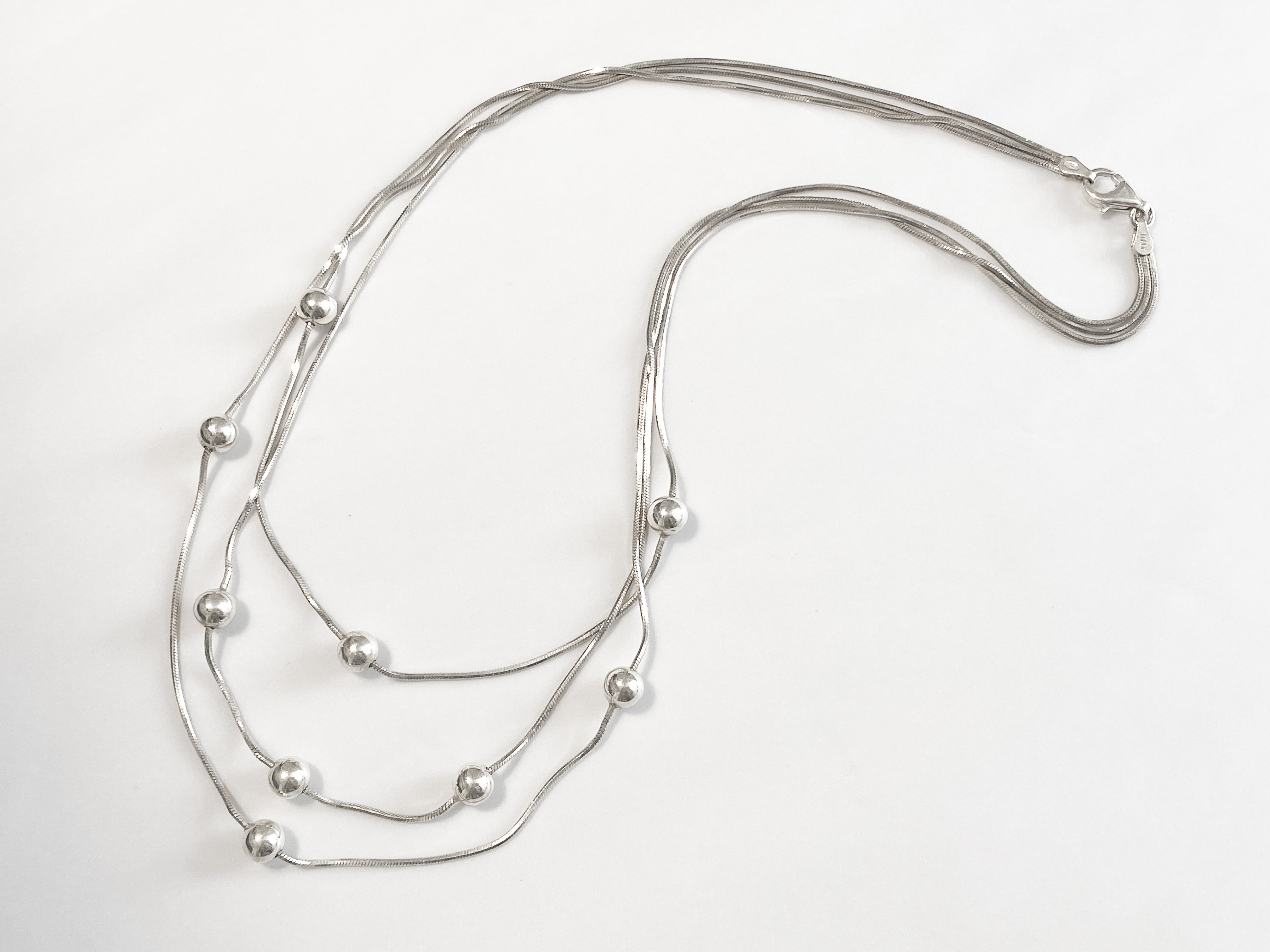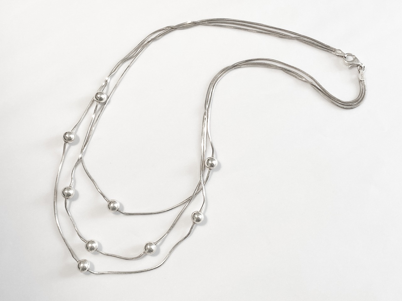イギリスで買い付けたこのMultiple Balls Layered Necklaceは、幾つものボールが重なり合ったようなユニークな3連チェーンのデザインが魅力的なネックレスです。カジュアルな日常使いはもちろん、特別な日のコーディネートにもぴったりのアクセサリーです!