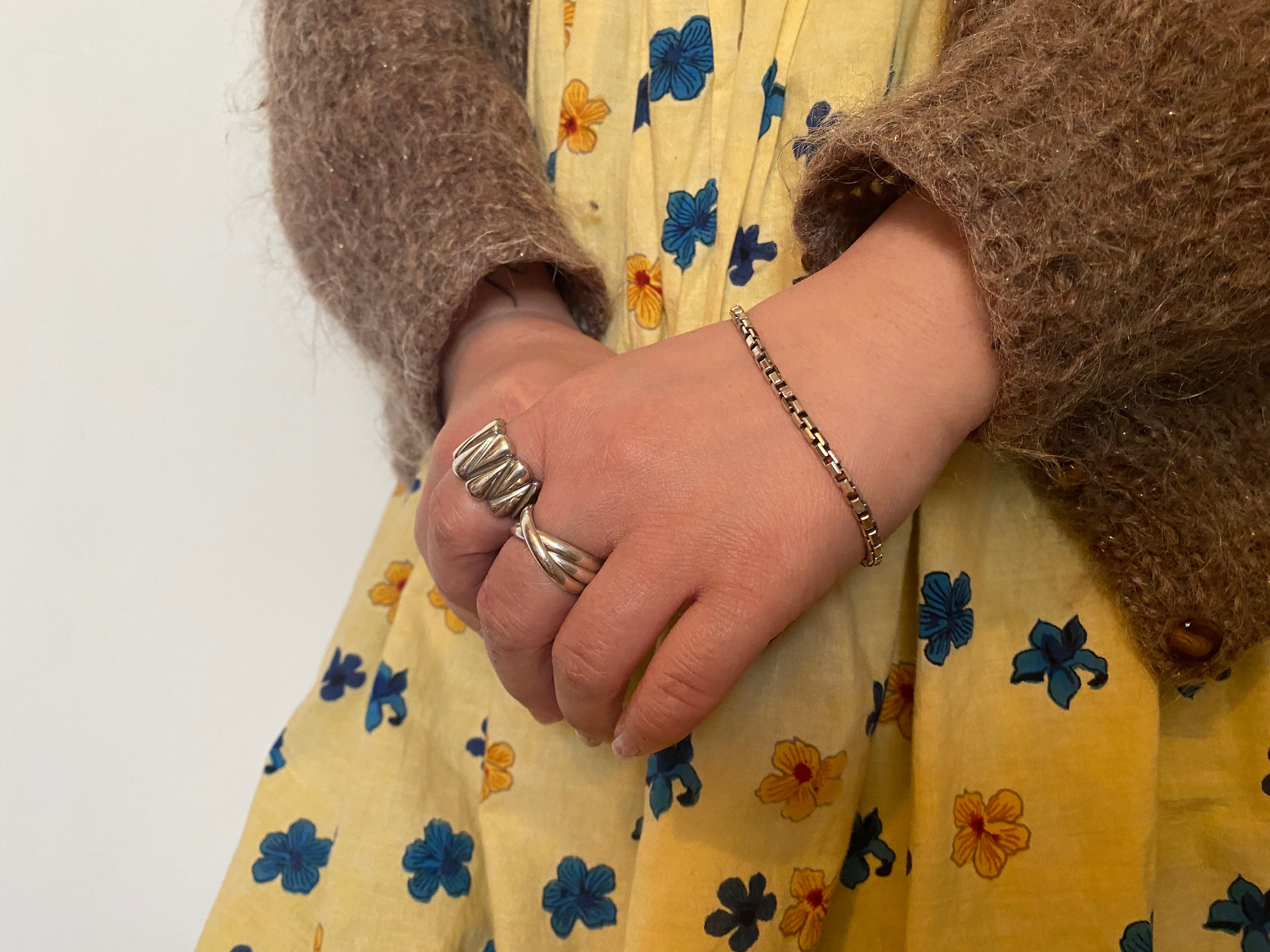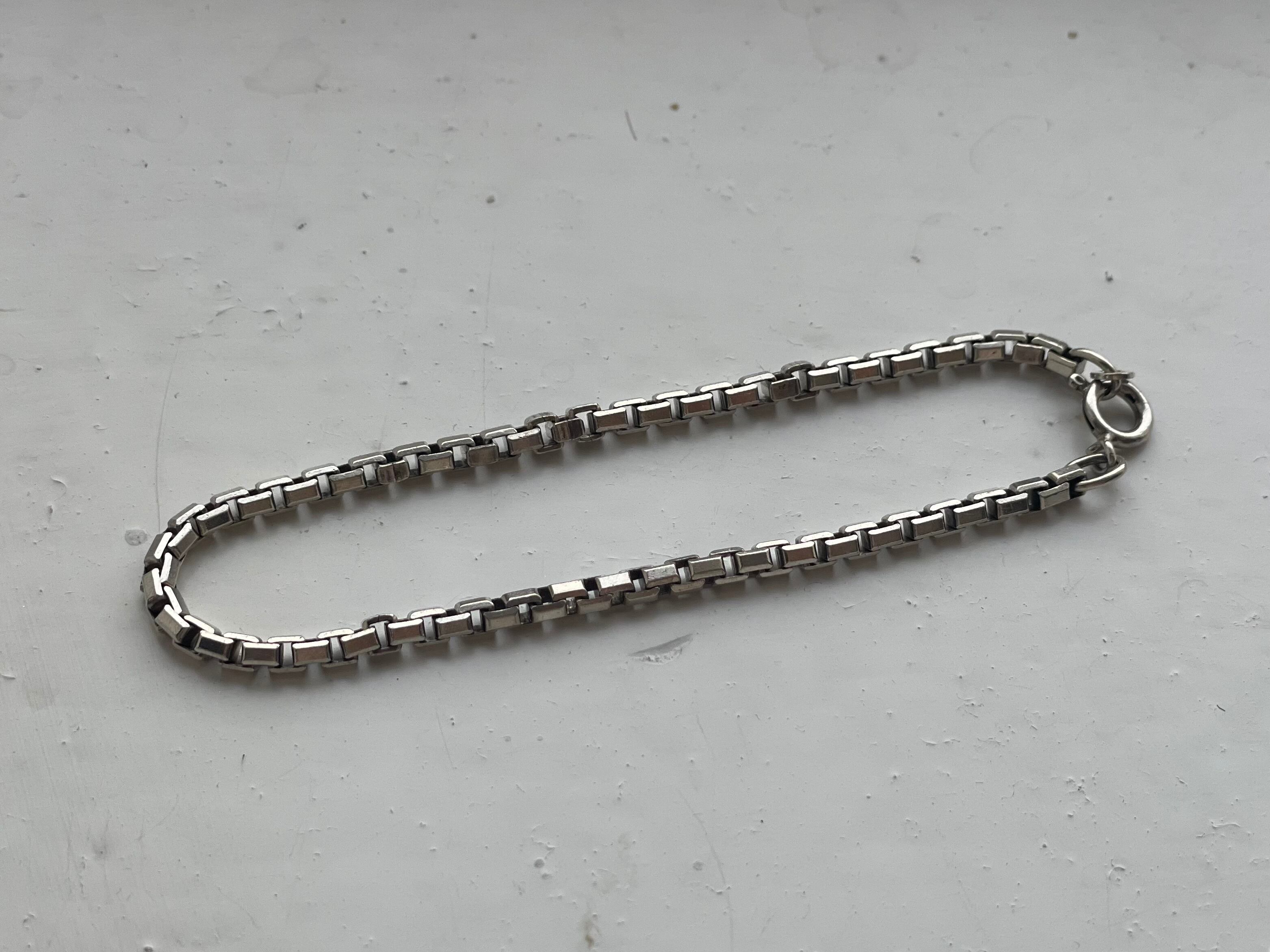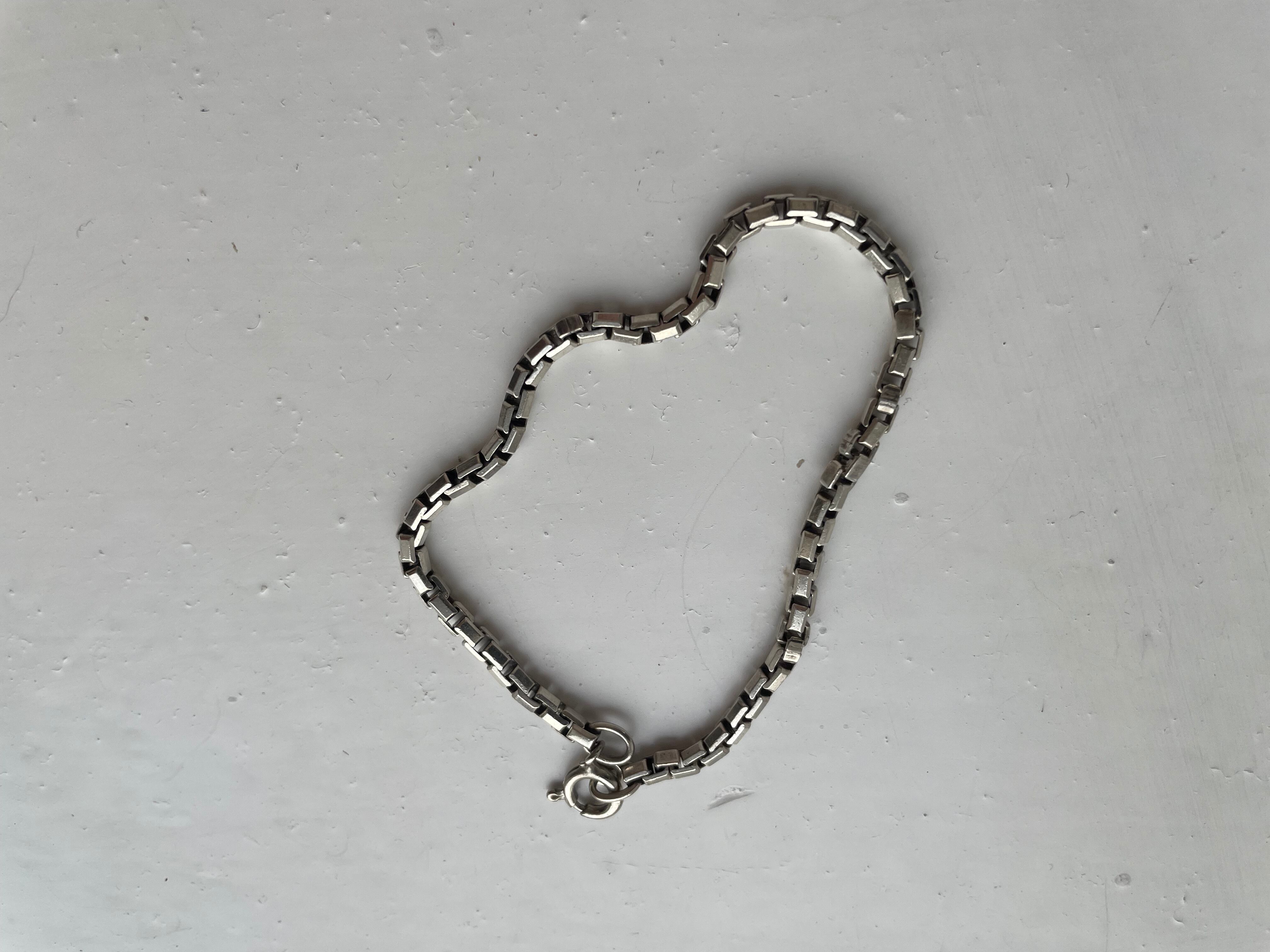 手元を華奢に演出する silver 925 vintage box chain bracelet。ドイツで厳選して買い付けたこのブレスレットは、四角いチェーンが連なった繊細でありながらも存在感を放つデザインが特長です。素材はシルバー925なので、耐久性にも優れています。普段使いにはもちろん、特別なシーンでもお楽しみいただけるアイテムです!